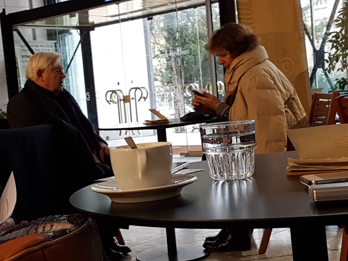 Bivši predsednik države in partije Milan Kučan in njegova dolgoletna svetovalka Špela Furlan sta danes opoldne spet zasedala v lokalu Idealist v Cankarjevem domu.