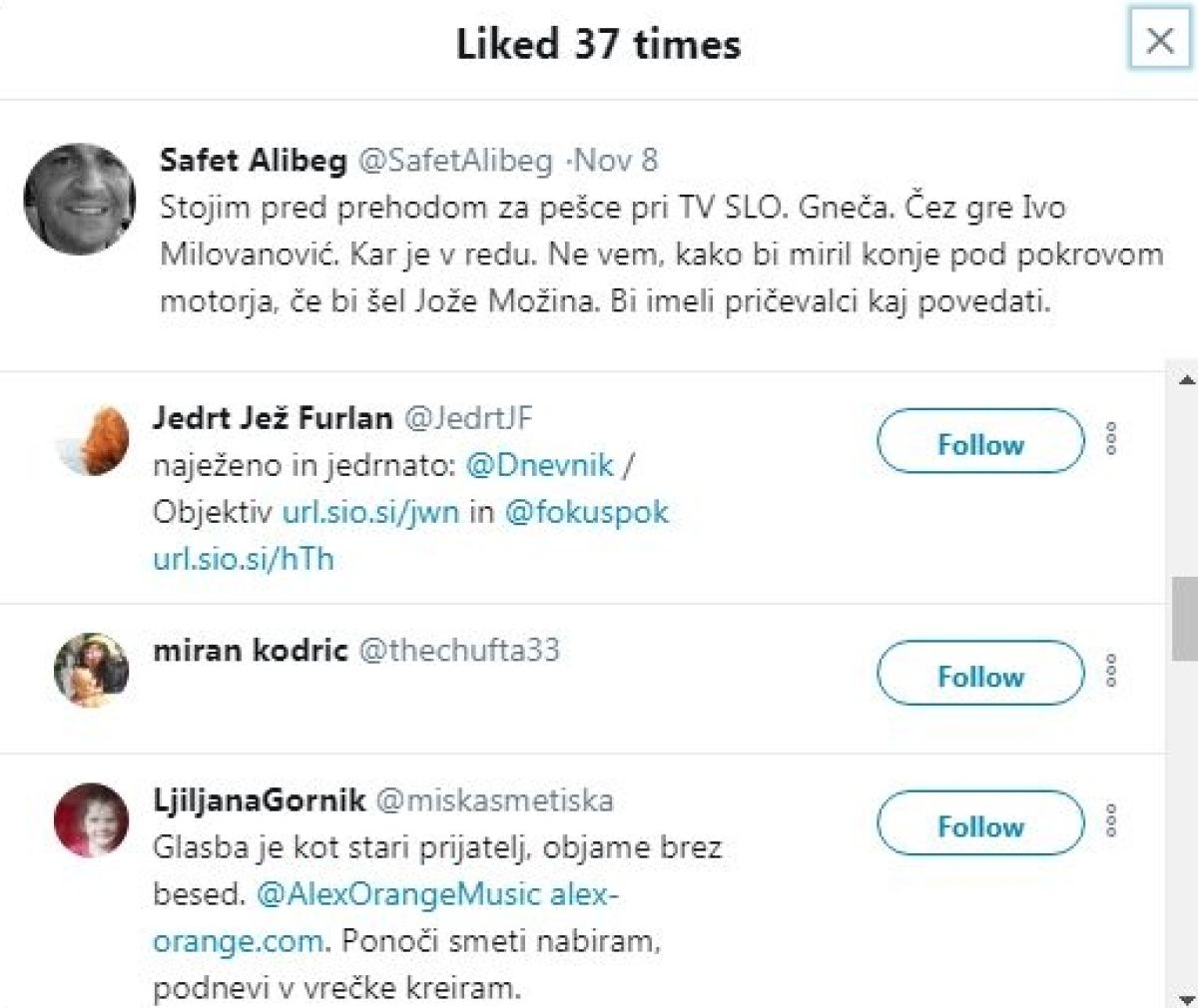 Safet Alibegić je na Twitterju napisal grozil novinarju TV Slovenija Jožetu Možini, ko je pisal, da ne ve, kako bi "miril konje", če bi šel pred njegovim avtom čez cesto Možina. V Združenju novinarjev in publicistov (ZNP) so nad tem zgroženi, še bolj pa nad programsko svetnico RTVS Jedrt Jež Furlan, ki je na Twitterju "všečkala" Alibegovićev tvit.
