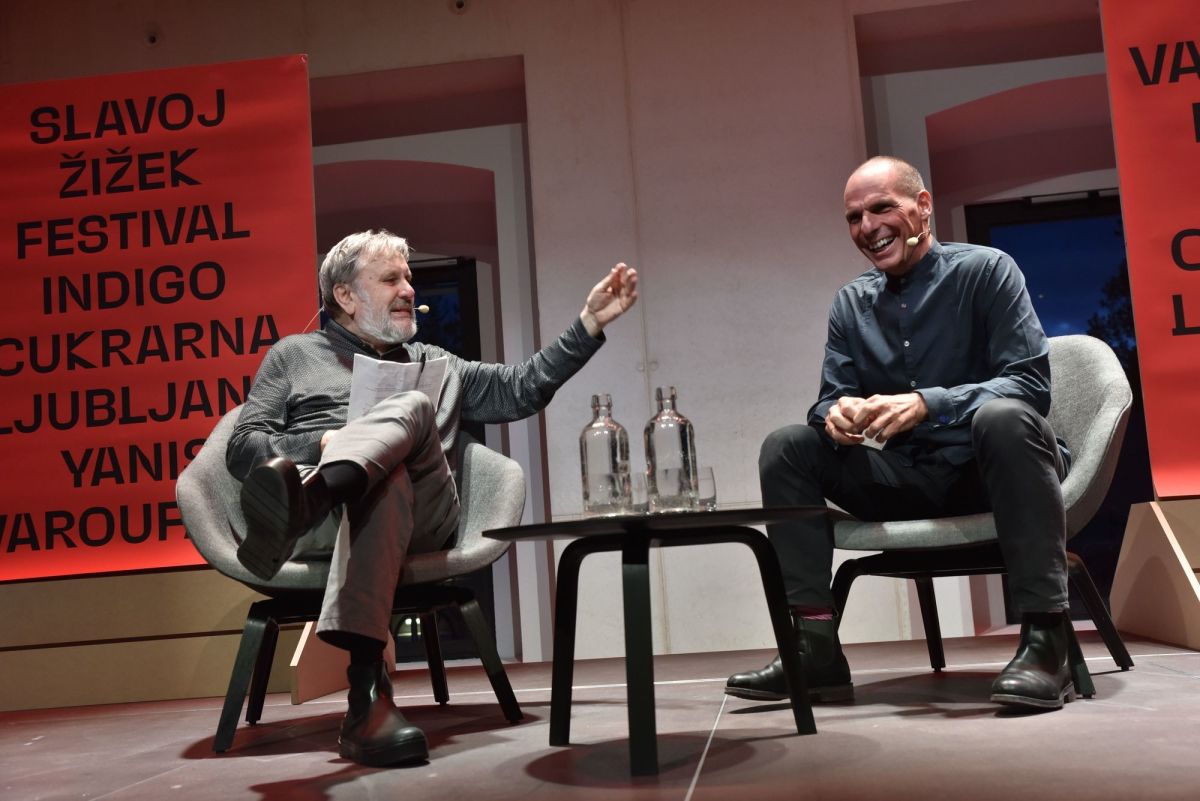 V ljubljanski Cukrarni se je včeraj odvil zanimiv pogovor med vodilnim slovenskim filozofom Slavojem Žižkom in nekdanjim grškim ministrom za finance, ekonomistom Janisom Varufakisom, v katerem sta obdelala reševanje grške finančne krize in preučevala, v kakšnem stanju sta danes kapitalizem in svet ter kam nas vodi tehnologija.