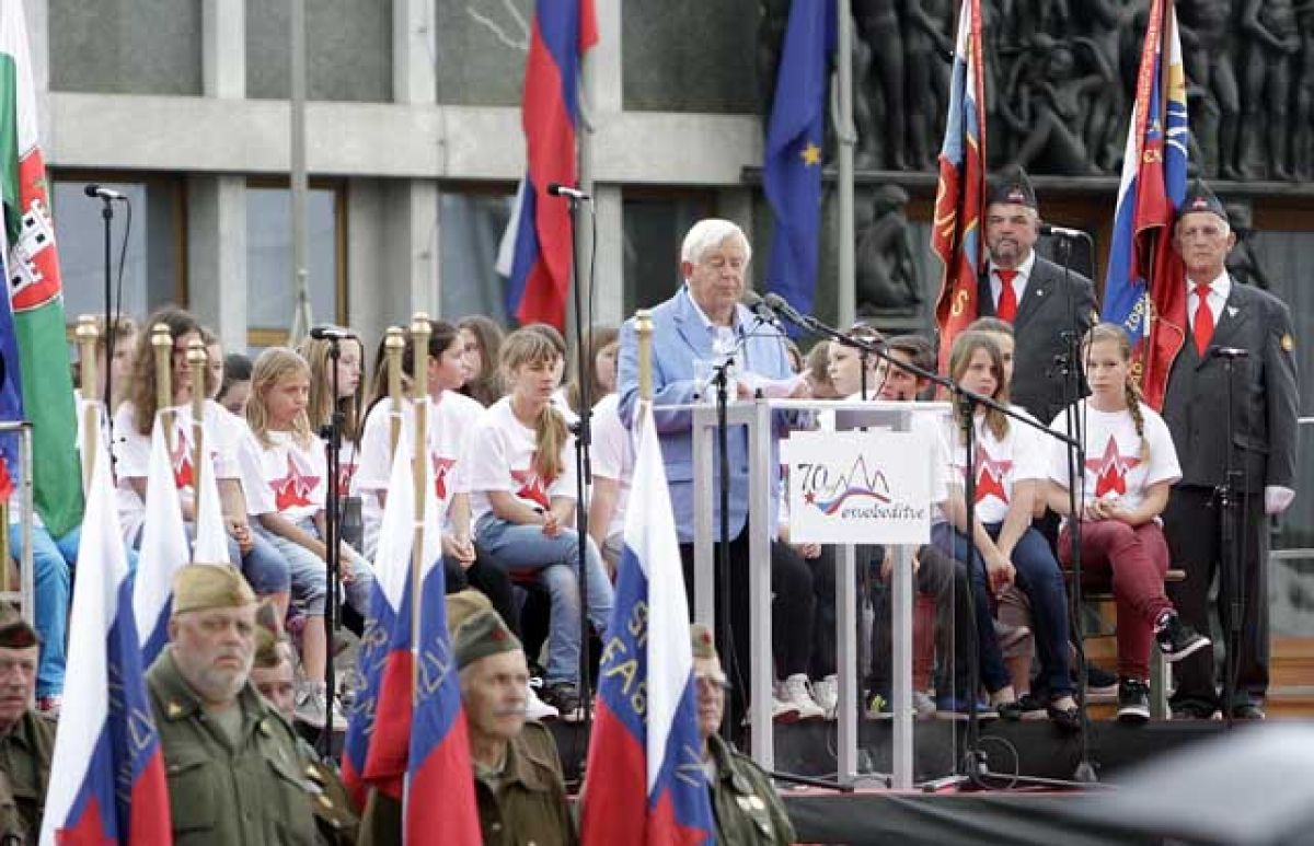 Slavnostni govornik Milan Kučan na prireditvi Pod svobodnim soncem, za katero so zlorabili osnovnošolske otroke.