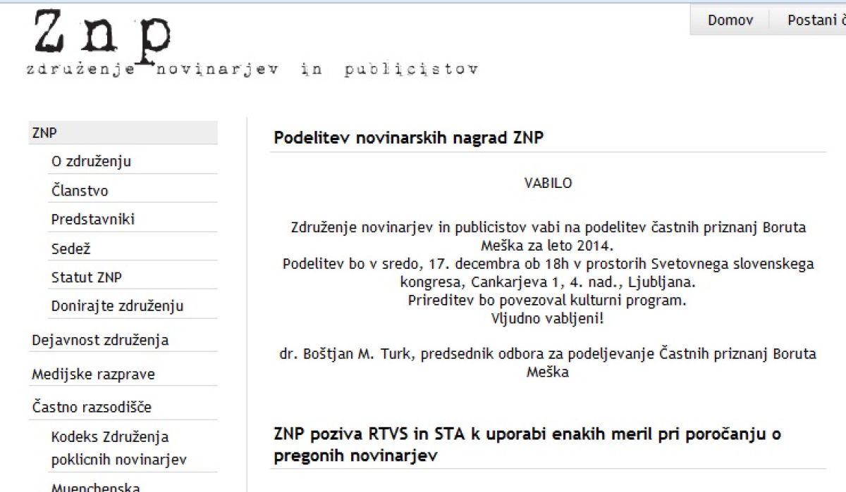 Združenje novinarjev in publicistov vabi na podelitev častnih priznanj Boruta Meška za leto 2014. Podelitev bo v sredo, 17. decembra ob 18h v prostorih Svetovnega slovenskega kongresa, Cankarjeva 1, 4. nad., Ljubljana. Prireditev bo povezoval kulturni program. Vljudno vabljeni!