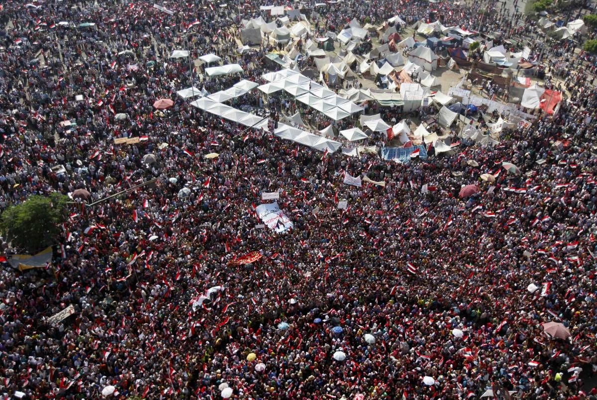Na Tahrirju so ljudje mahali z rdečimi kartoni in egiptovskimi zastavami ter vzklikali gesla "Odidi! Odidi!" ter "Ljudje želijo strmoglaviti režim", sicer poznana že iz protestov proti Mubarakovi vladavini spomladi 2011.
