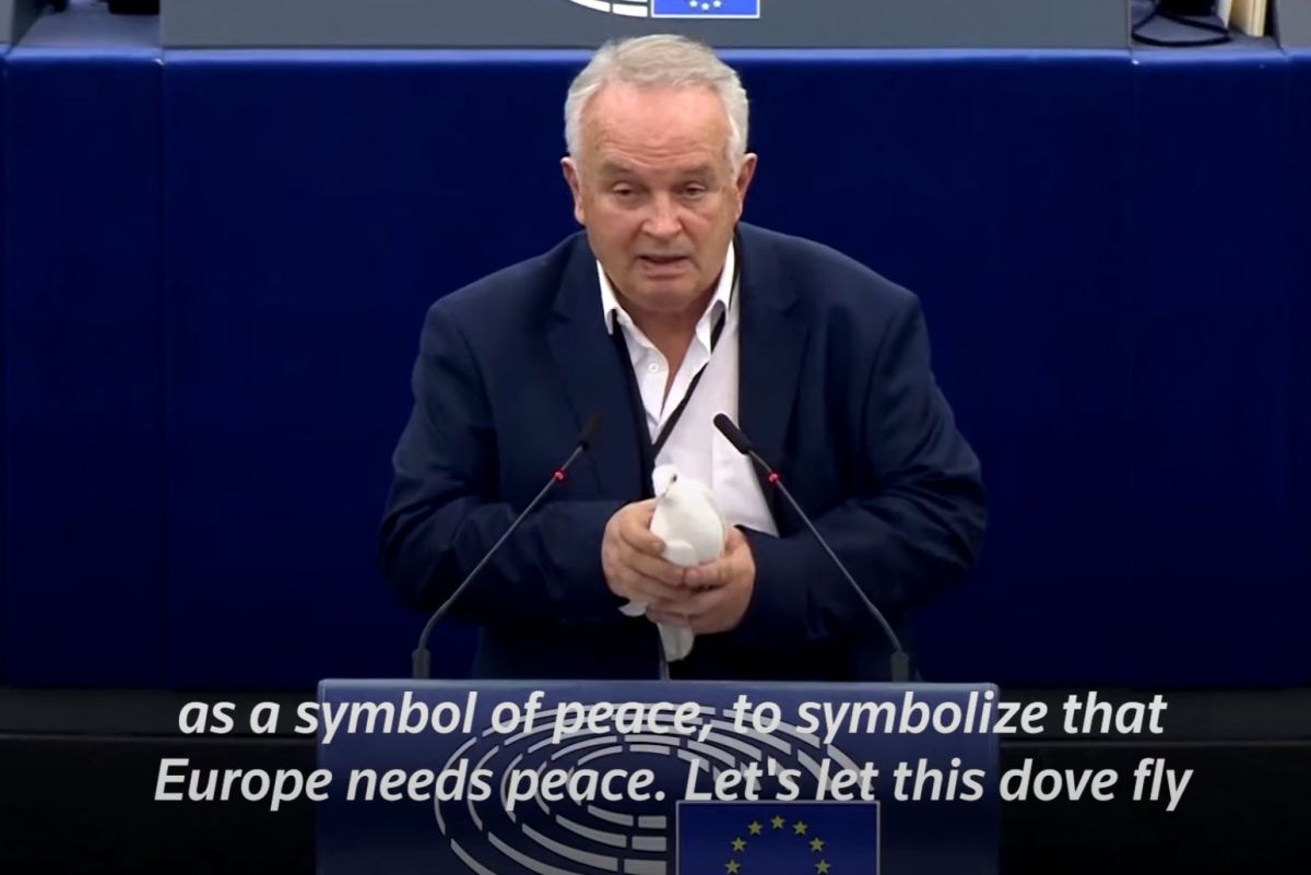 Slovaški evroposlanec Miroslav Radačovsky iz stranke Patriot je v sredo zvečer v Evropskem parlamentu v Strasbourgu izpustil belo golobico in ob tem zaželel "mir Evropi in svetu". Številne poslance je njegova poteza presenetila, nekateri pa so menili, da je šlo za kršitev pravil.