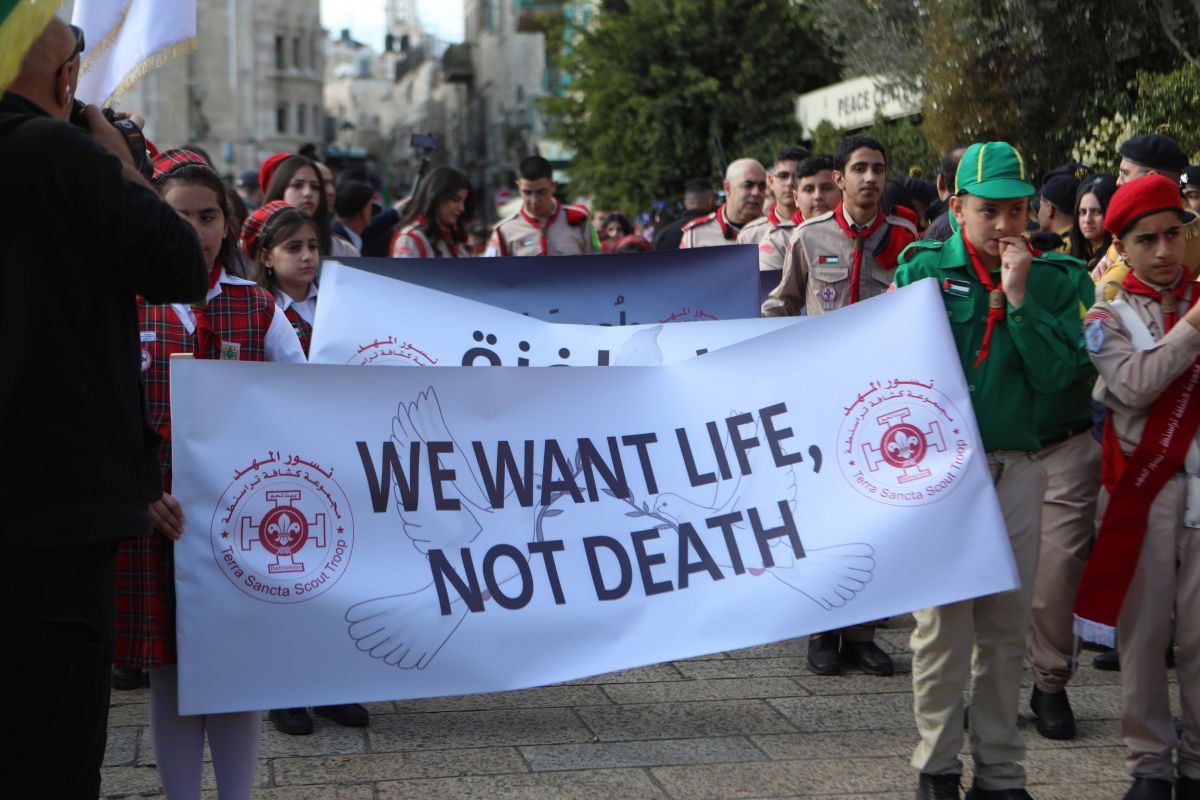 V Betlehemu na zasedenem Zahodnem bregu se je danes zbralo le nekaj sto ljudi, kar je bistveno manj v primerjavi z množicami turistov in romarjev v letih pred vojno v Gazi. Jutranjo tišino na trgu Manger je prekinila skupina skavtov, ki je s transparenti opozarjala, da se njihovi otroci v prazničnih časih želijo igrati in smejati.