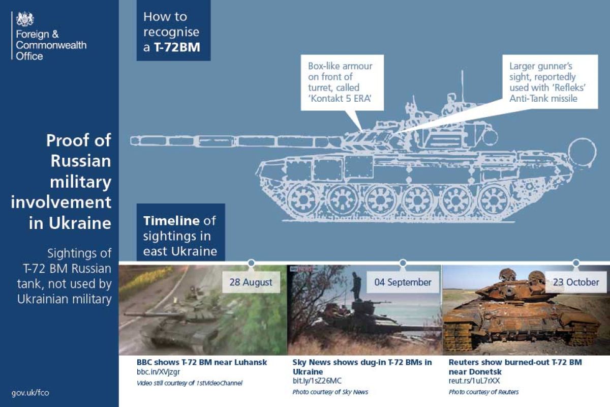 Tvitu so pripete grafika z logotipom britanskega zunanjega ministrstva, ki prikazuje, po čem je mogoče prepoznati ruski tank T-72BM, in fotografije takšnih tankov v Ukrajini s pripisom, da jih ukrajinska vojska ne uporablja.