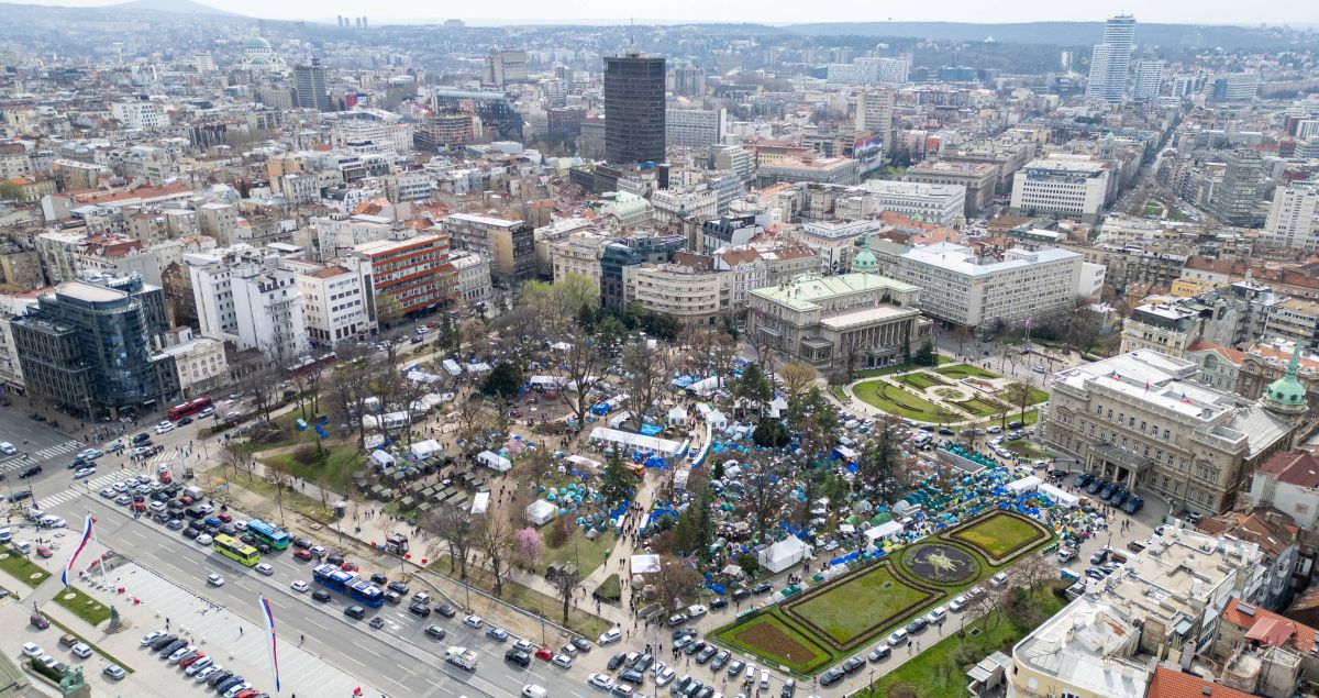 Tabor so vzpostavili marca v odgovor na proteste študentov po nesreči na železniški postaji v Novem Sadu. Pred parlamentom zdaj postavljajo božično vas, ki naj bi jo kmalu odprli.
