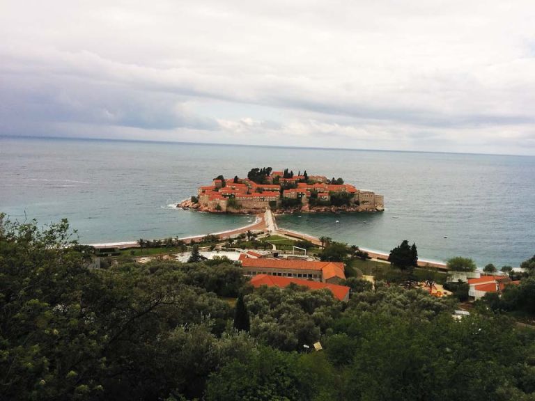 Pred stojnicami smo srečali domačina, ki nas je ogovoril v slovenščini. Pred 30 leti je živel in delal na Jesenicah. Zaradi zastoja nam je svetoval obisk sv. Štefana s čolnom, predlagal nam je tudi voznika. Ta nas je pozneje, ko smo si že ogledalo stari del mesta, odpeljal pred pravljični otoček, na katerega pa nismo mogli stopiti. Ves otoček, ki je sicer povezan s celino s cesto, je hotelski kompleks, vstop je samo za goste. Ampak tudi od daleč je čudovit. V Budvo smo se vrnili s taksijem, ki nas je odložil na že omenjenem cestnem zamašku. Od tam smo dobre pol ure pešačili do avta po Slovenski (Slovanski) plaži.