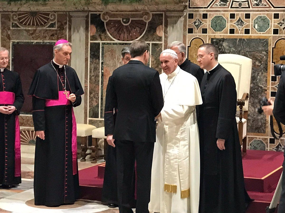 Papež je včeraj v Vatikanu sprejel voditelje 27 članic unije in osrednjih institucij unije, ki ta konec tedna v Rimu obeležujejo 60. obletnico podpisa pravnega temelja unije, rimske pogodbe. Avdience pri papežu se je udeležil tudi premier Miro Cerar s partnerico Mojco Stropnik.