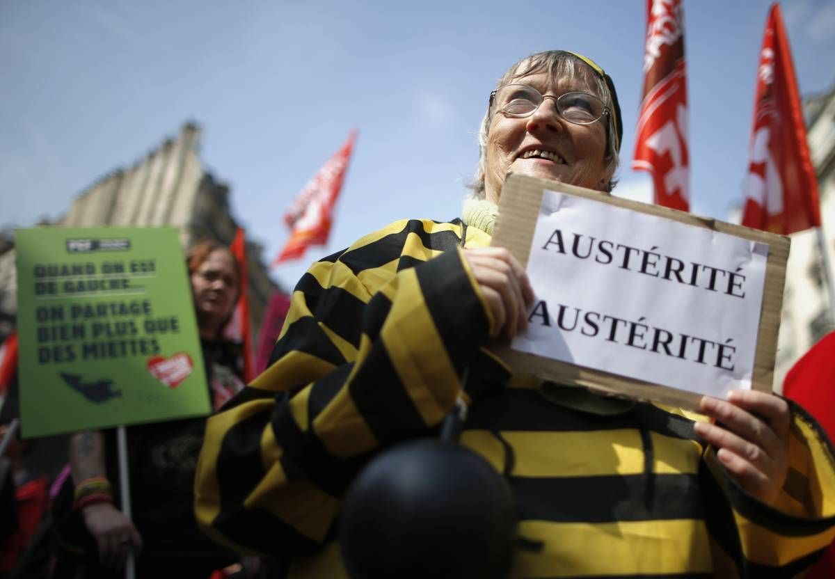 "Hollande, dovolj je!" je pisalo na transparentu na kipu na Trgu Republike, s katerega so protestniki krenili na protestni pohod po središču mesta "proti strogim varčevalnim ukrepom ter za enakost in razdelitev bogastva".