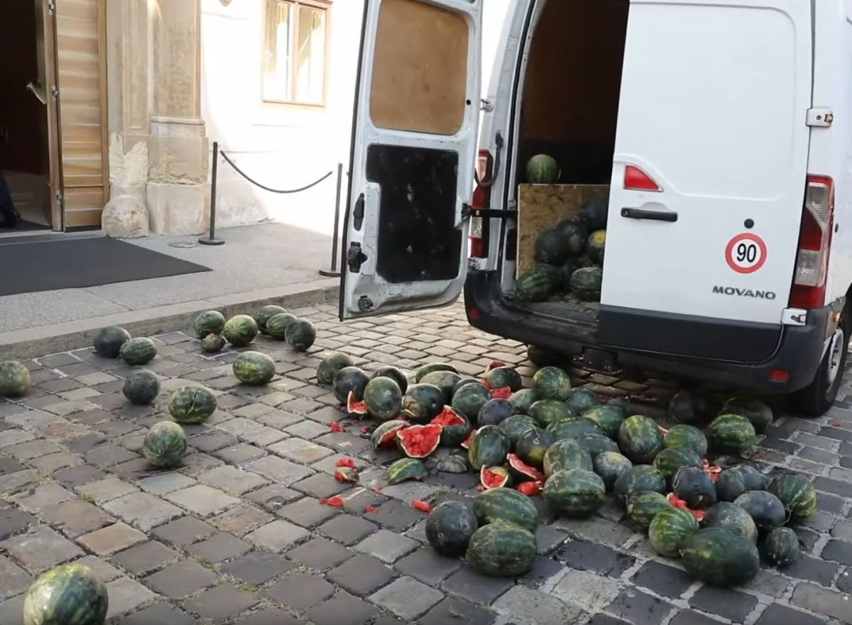 Hrvaški poslanec pred Banske dvore stresel kup lubenic, Andrej Plenković se počuti ogroženega (VIDEO)