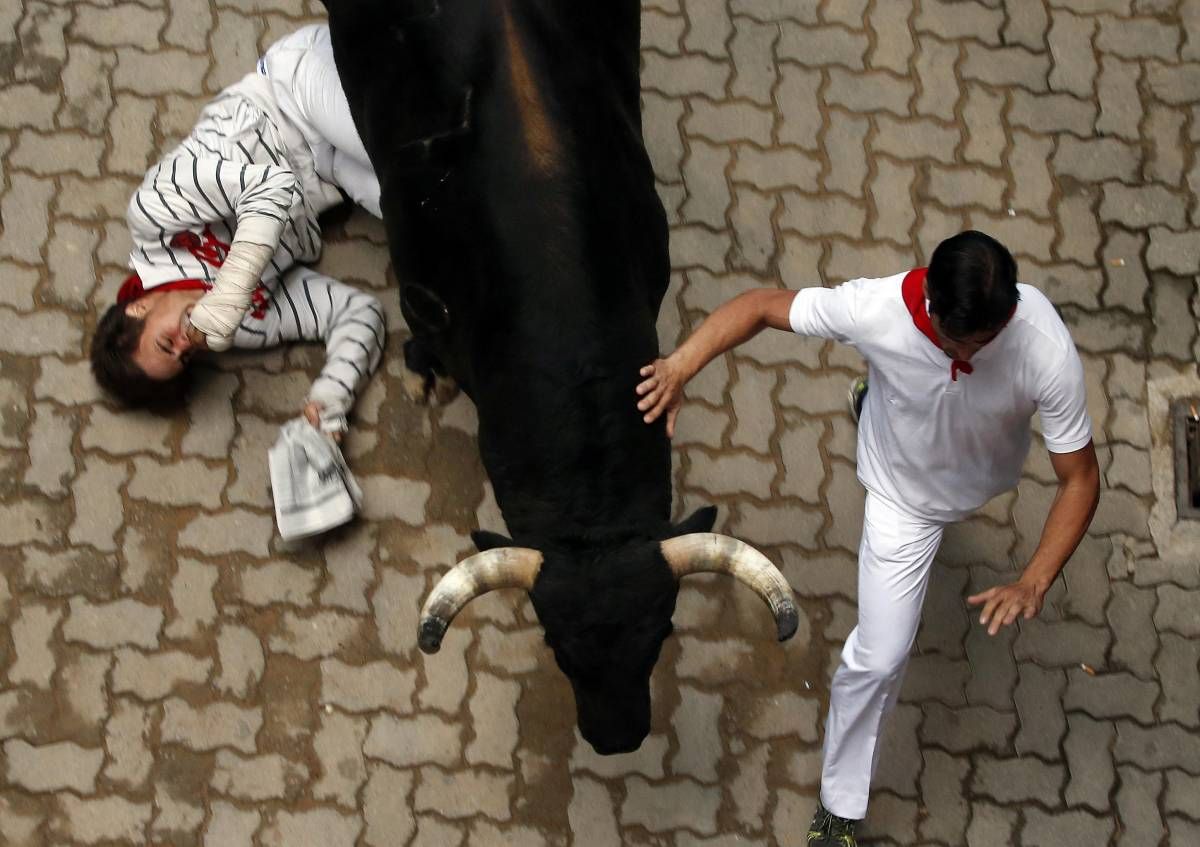 Današnji tek pred biki na festivalu San Fermin v španski Pamploni je zaznamoval množični padec. Pred vhodom v areno, ki je cilj teka, se je namreč eden čez drugega spotaknilo več tekačev, množica pa je nato povsem zaprla vstop v areno. Nastal je kaos, ko so nekateri poltonski biki zagnali v ljudi. Več ljudi je bilo huje ranjenih.