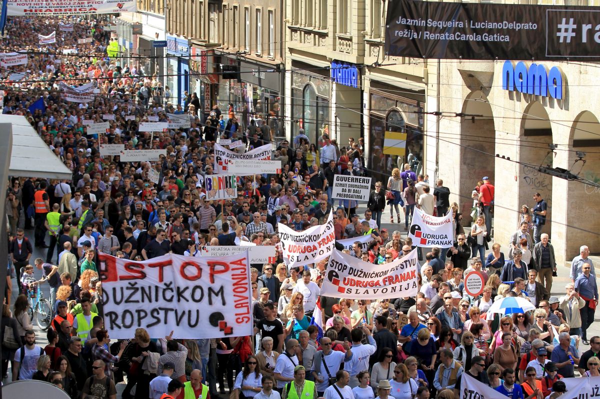 Združenje hrvaških posojilojemalcev v švicarskih frankih je na včerajšnje proteste v Zagrebu privabilo več tisoč ljudi, med katerimi so bili tudi protestniki iz Srbije, BiH in Slovenije. Po ocenah hrvaških medijev se je shoda v središču Zagreba udeležilo od 6000 do 7000 ljudi. Zahtevali so predvsem odstop guvernerja centralne banke Borisa Vujčića.
