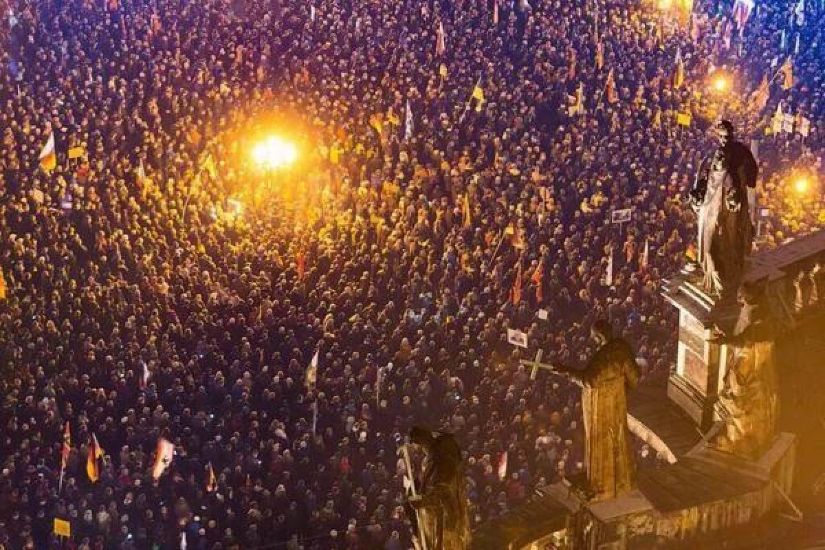 Tokrat je bilo na dresdenskem trgu pred opero še posebej slovesno. Pegida, patriotska organizacija, ki nasprotuje množičnemu priseljevanju in islamizaciji zahodnih držav (Patriotische Europäer gegen die Islamisierung des Abendlandes), je praznovala prvo obletnico. Tik pred začetkom je policija dežele Saške na svojem tviter profilu zapisala, da je zborovanje zelo nabito s čustvi in pozvala protestnike, naj ostanejo mirni. Nekaj izgredov so kasneje izzvali levičarski aktivisti, ki so napadli policiste in pripadnike Pegide, je poročal portal DW.
