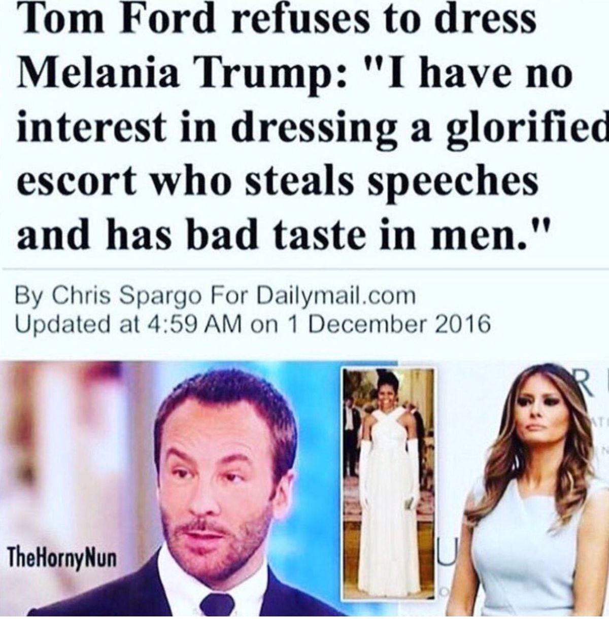 Modnemu kreatorju Tomu Fordu na družabnih omrežjih ploskajo, ker naj bi prvo damo ZDA Melanio Trump primerjal s prostitutko in izjavil, da je ne bo nikoli oblačil v svoje kreacije. A Tom Ford tega ni nikoli izjavil in tudi javno zanika, da bi rekel kaj žaljivega o Melanii.