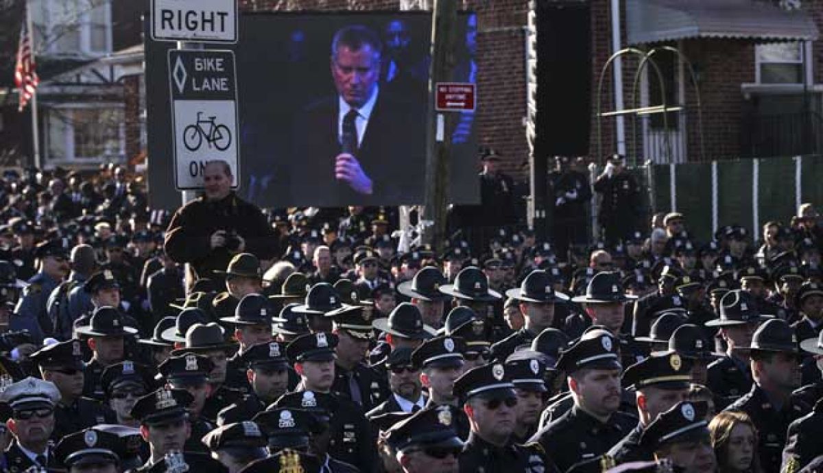 Tudi včeraj so se številni policisti pred cerkvijo ob nastopu DeBlasia obrnili in velikemu zaslonu, na katerem so predvajali slovesnost, pokazali hrbte. V sami cerkvi so bili žalujoči prijaznejši in so županu namenili vljuden aplavz. "Vso mesto žaluje in žaluje iz številnih razlogov," je poudaril DeBlasio in dodal, da je najbolj oseben ta, "da smo izgubili tako dobrega moža".