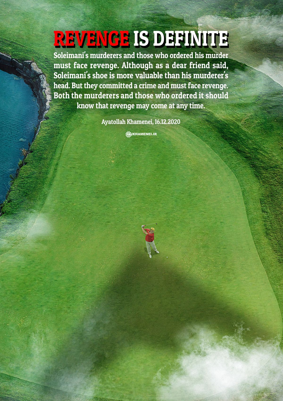 Tvit vključuje fotografijo, na kateri moški, ki spominja na Trumpa, igra golf v senci vojaškega letala ali velikega drona. "Maščevanje je neizogibno," piše v tvitu.