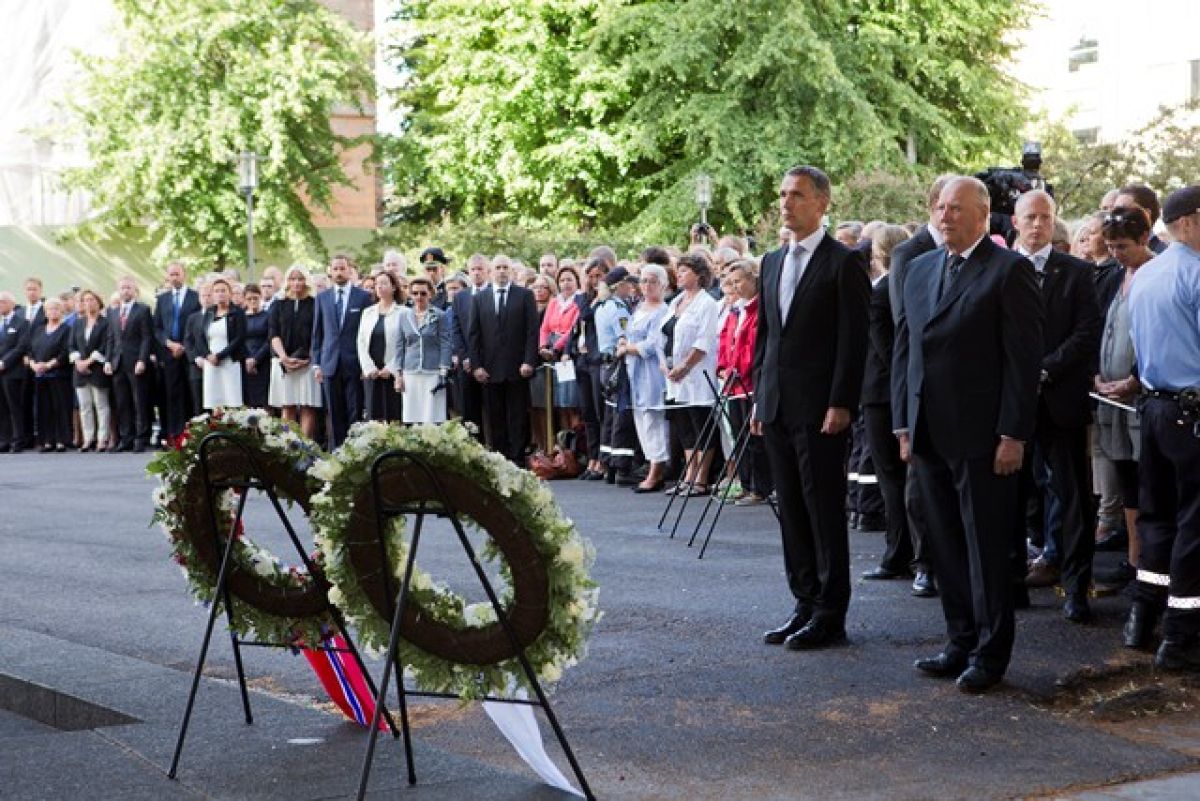 Polaganja venca v Oslu, kjer je v bombnem napadu umrlo osem ljudi, se je udeležil tudi norveški kralj Harald V. Preživeli napada na otoku Utoya, kjer je Breivik vzel življenje 69 članom podmladka norveških laburistov, in njihovi svojci pa so se zbrali na spominski slovesnosti na otoku. Kasneje se jim bo tam pridružil tudi Stoltenberg.
