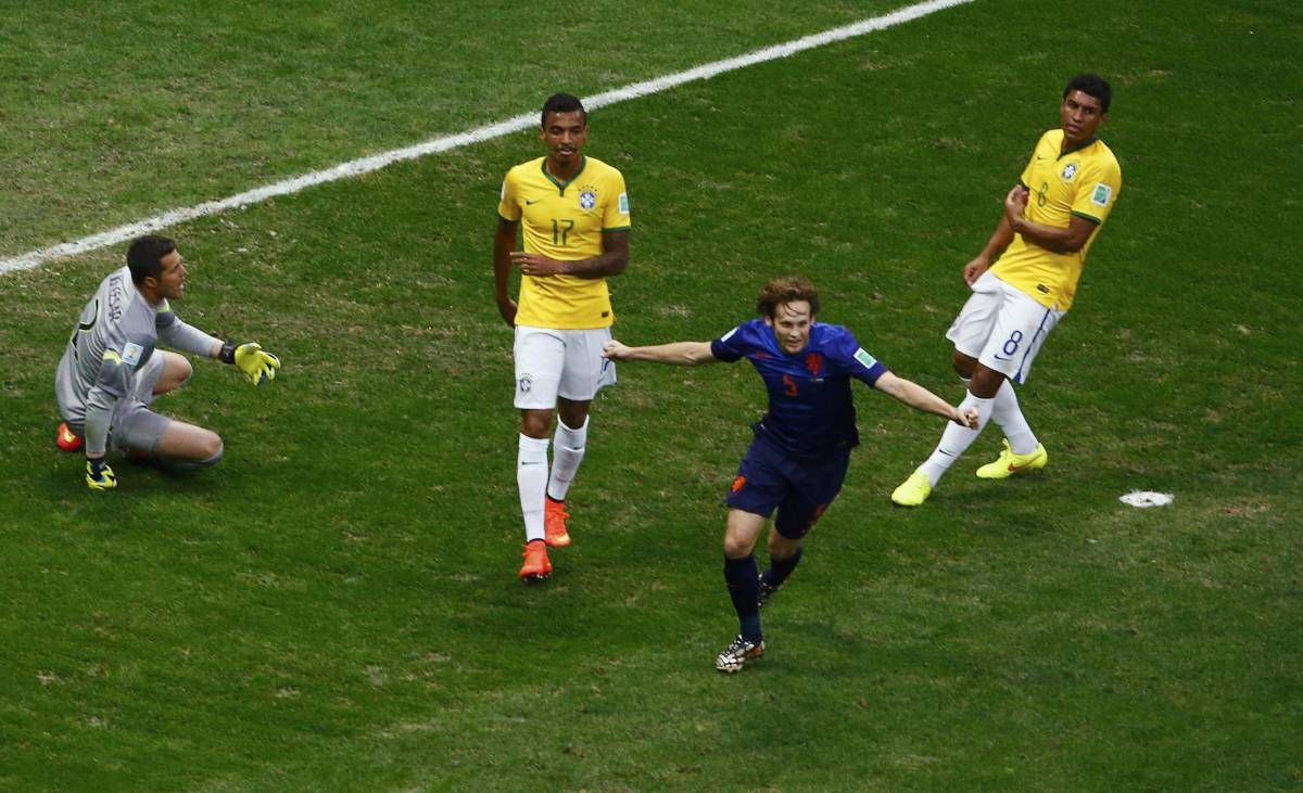 A na igrišču so prvi šok doživeli Brazilci. Thiago Silva je Arjena Robbna po hitrem protinapadu zaustavil s prekrškom na robu kazenskega prostora, alžirski sodnik pa je po napaki brez oklevanja pokazal na belo točko, iz katere je zanesljivo zadel Manchestrov Robin van Persie. Novo napako brazilske obrambe in Davida Luiza je v 17. minuti kaznoval David Blind, ki je v kazenskem prostoru sam prišel do odbite žoge in jo neoviran zabil v gol.