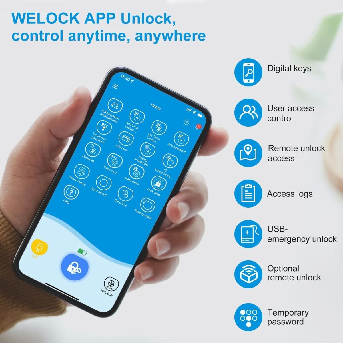 Naprava omogoča odklepanje v zgolj 0,3 sekunde zahvaljujoč naprednemu senzorju, obenem pa vsebuje anti-peep tipkovnico, ki omogoča vnos naključnih številk pred ali za pravim PIN-om ter tako varuje pred pogledi. WELOCK