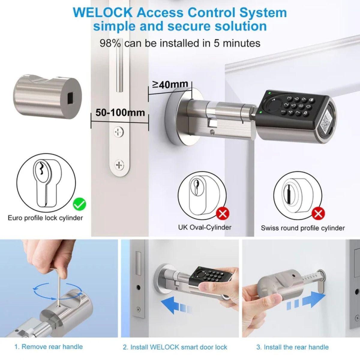 Namestitev je preprosta: cilindrični mehanizem za Evropski profil (50–100 mm) je zasnovan za hitro zamenjavo obstoječega – brez zapletenega vrtanja ali obsežne montaže. WELOCK