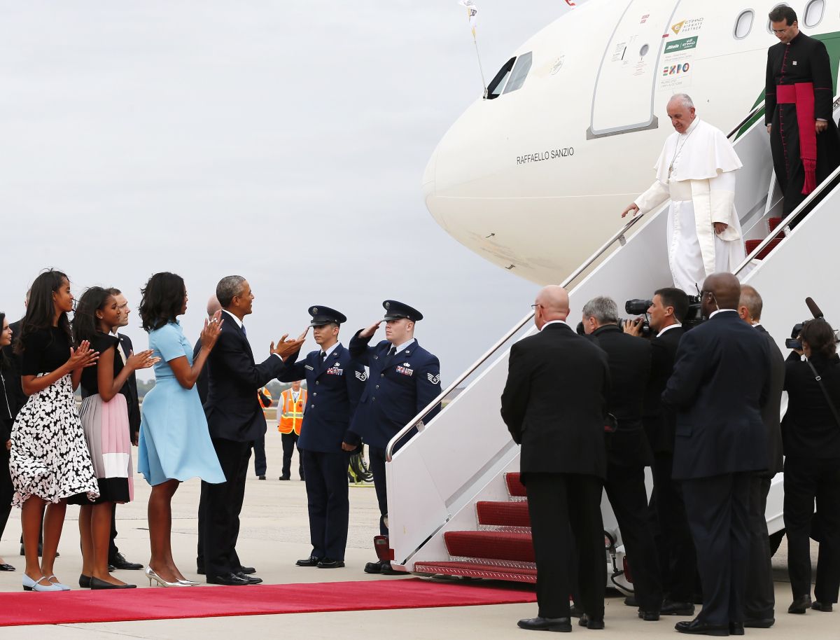 Ameriški predsedniki običajno svetovne voditelje pozdravijo, ko pridejo v Belo hišo, Obama pa je tokrat prišel do letala v bazi Andrews in papeža osebno pozdravil na rdeči preprogi v znamenje velikega spoštovanja. Tam so bili tudi vojaki častne straže in šolarji, duhovniki, drugi cerkveni dostojanstveniki in politiki.