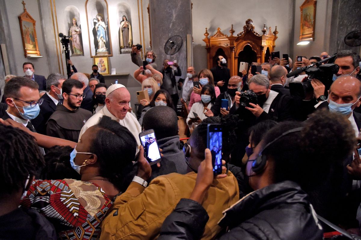 Pred cerkvijo, kjer je potekalo srečanje, se je zbralo kakih sto migrantov, nekateri so imeli dovoljenje za sodelovanje na molitvi, drugi ne, a so prišli pred cerkev v upanju, da bodo lahko videli papeža, poroča francoska tiskovna agencija AFP.