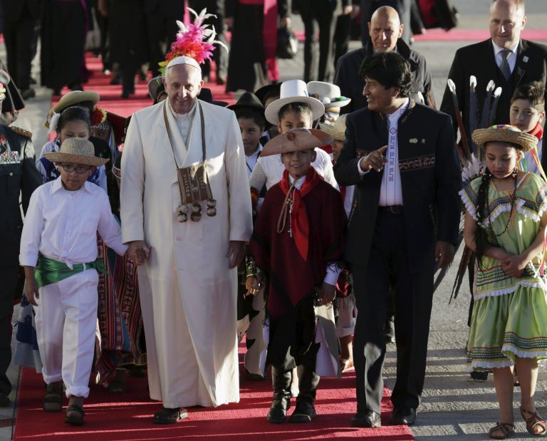 V Argentini rojeni papež je na slovesnosti ob njegovem prihodu pohvalil Bolivijo za njena prizadevanja za sobivanje različnih etničnih skupin. "Španski jezik, ki je bil v to deželo prinesen, zdaj veselo sobiva s 36 domorodnimi jeziki, ki skupaj - tako kot rdeča in rumena v nacionalnih rožah kantuta in patuju - ustvarjajo lepoto, enotnosti in raznolikost," je poudaril.