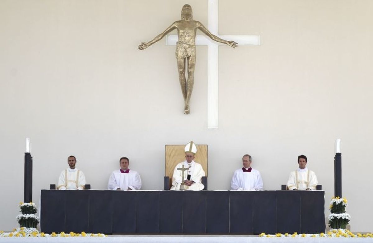 Papež Frančišek je danes v romarskem središču Fatima za svetnika razglasil brata in sestro, ki se jima je leta 1917 kot otrokoma prikazala Marija.