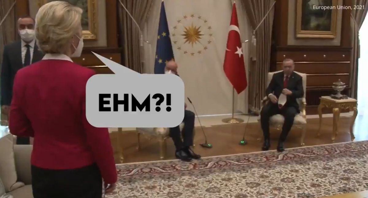 Po torkovem srečanju von der Leynove in Michela z Erdoganom v Ankari je po spletu zaokrožil posnetek, na katerem Michela v Turčiji posadijo na stol poleg Erdogana, von der Leynova pa nekaj časa presenečeno stoji in reče "hm". Nato posnetek prikazuje, kako sedi na kavču, nekoliko oddaljenem od sedežev predsednikov. Na kavču nasproti nje je sicer sedel tudi turški zunanji minister, ki je na srečanju spremljal Erdogana.