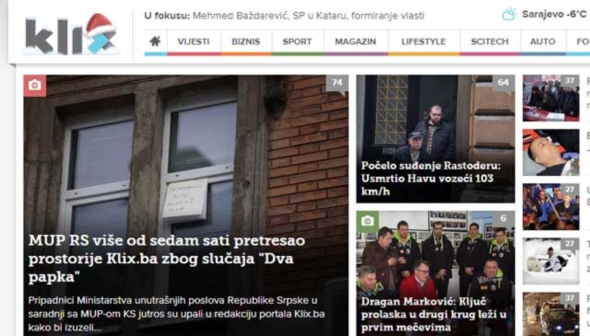 Sarajevska policija je danes sprožila preiskavo v prostorih priljubljenega internetnega portala Klix, ker da noče razkriti vira tajnih posnetkov premierke Republike Srbske Željke Cvijanović. Ta je na posnetkih govorila o podkupovanju poslancev za zagotovitev večine stranki SNSD, ki jo vodi predsednik te entitete Milorad Dodik.