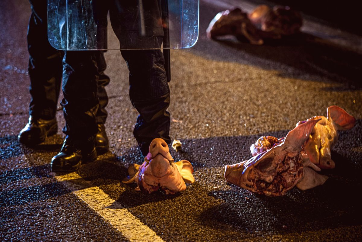 Prašičje glave letele na španske policiste (FOTO in VIDEO)
