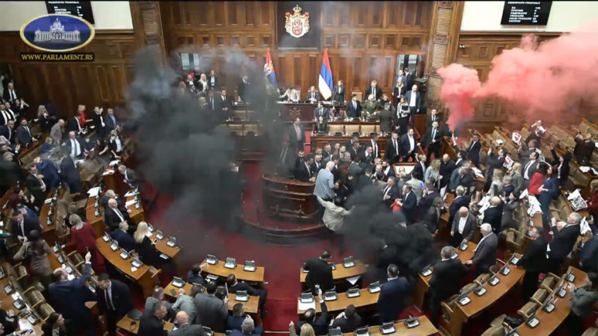 Pretep, dimne bombe in bakle v dvorani srbske narodne skupščine