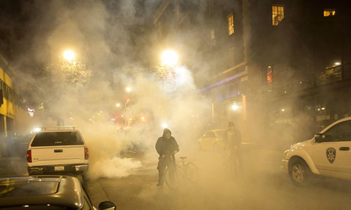 Protestniki od srede vsako noč zavzemajo dele številnih ameriških mest. Do sobote zvečer so bili protesti mirni, takrat pa so okrog univerze Berkeley v Kaliforniji in v Seattlu v državi Washington policisti proti protestnikom v Kaliforniji uporabili solzivec. Nekaj sto protestnikov je namreč uničevalo policijska vozla in obmetavalo policiste z različnimi predmeti.