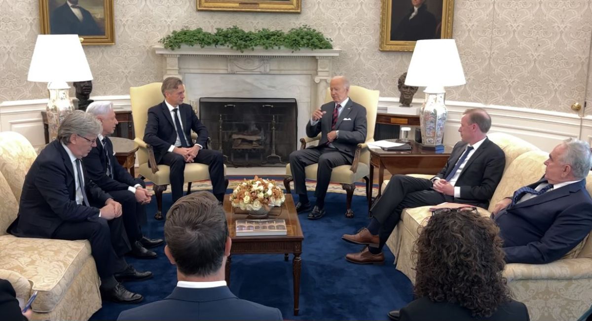 Pogovor v Ovalni pisarno, kjer so na slovenski strani ob premierju sodelovali še državni sekretar na nacionalno varnost Vojko Volk, veleposlanik v Washingtonu Iztok Mirošič, šef Golobovega kabineta in njegova tiskovna predstavnica, je bil sicer predviden za eno uro. Ameriški predsednik je imel ob sebi svetovalca za nacionalno varnost Jaka Sullivana in Kurta Campbella, namestnika državnega sekretarja Anthonyja Blinkna, ki je tik pred tem odpotoval na novo turnejo na Bližnji vzhod.