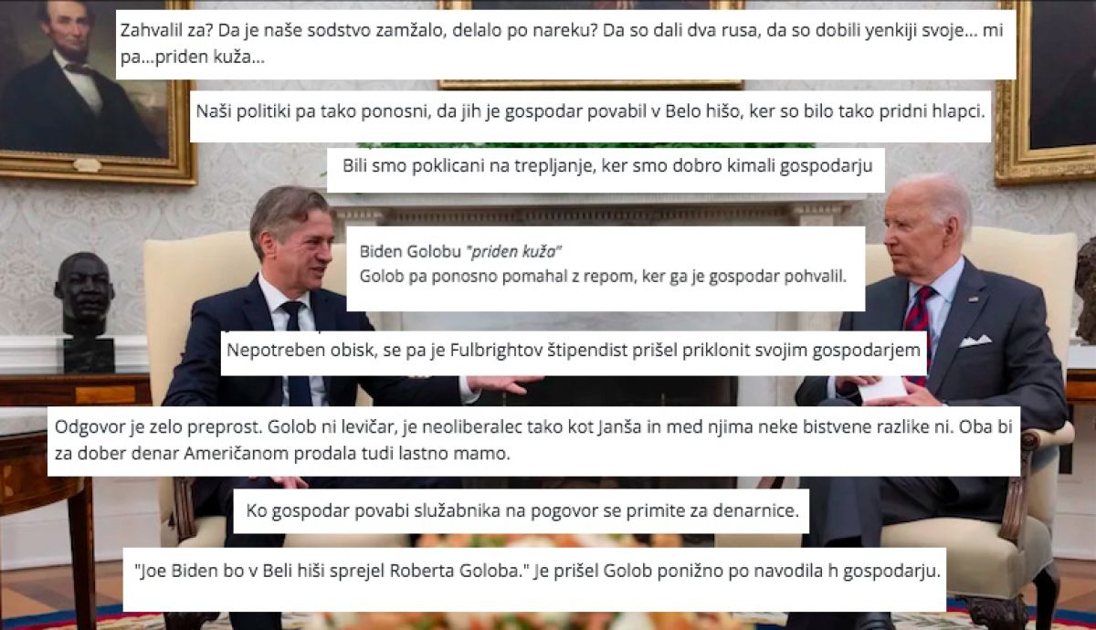 Golobov obisk Bele hiše je odprl stare rane antiameriškega resentimenta na Slovenskem. Že dolgo se na spletnih forumih ni tako usulo po kakšnem premierju, kot se je minuli teden po Golobu. Nenadoma so vsi pozabili na kazensko ovadbo policije, nenadoma je bila pomembna zgolj njegova domnevna servilnost Američanom, klečeplazenje, prilizovanje …