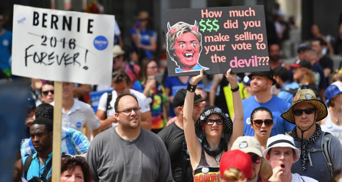 Potem ko je senator iz Vermonta Bernard Sanders v dvorani Wells Fargo izrekel podporo predsedniški kandidaturi Hillary Clinton, se je skupina njegovih delegatov in privržencev demonstrativno odpravila iz dvorane v bližnji novinarski šotor, kjer so posedli in več kot uro razlagali svojo pravico.