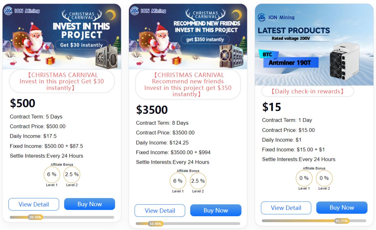 ION Mining ponuja vrsto učinkovitih možnosti rudarskih pogodb, ki segajo od 15 $ do 200.000 $, vsaka s svojo donosnostjo naložbe (ROI) in trajanjem pogodbe.
