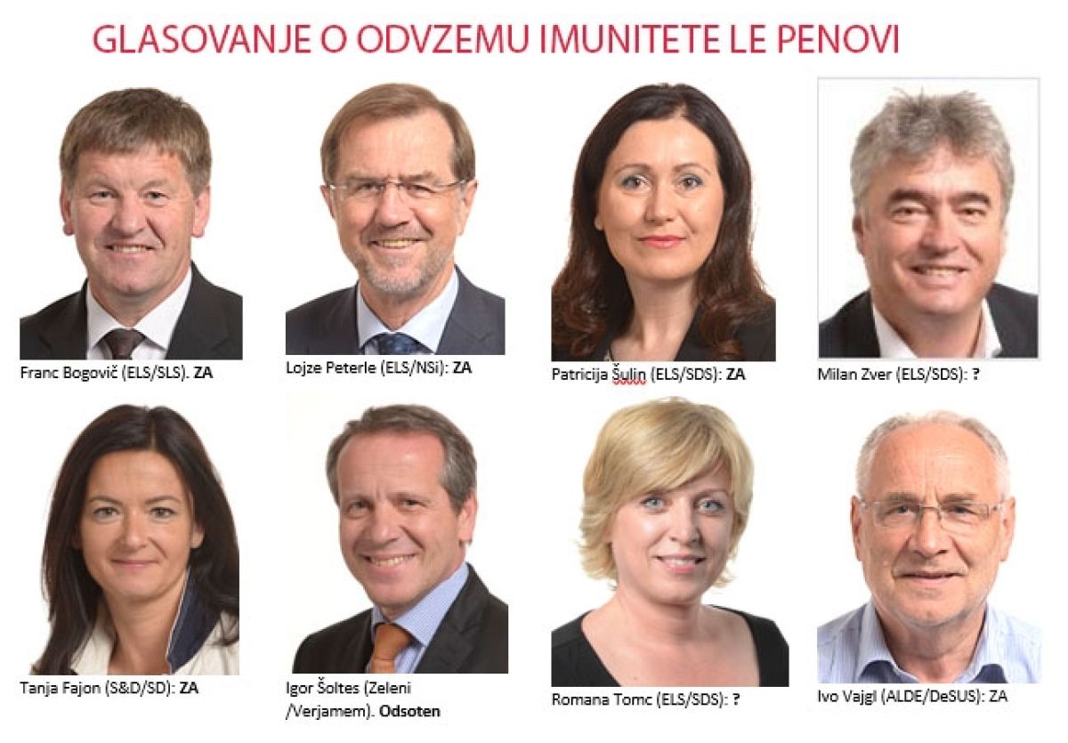 Za odvzem imunitete kandidatki za francosko predsednico Marine Le Pen so od slovenskih poslancev evropskega parlamenta glasovali Ivo Vajgl, Tanja Fajon, Lojze Peterle, Franc Bogovič in Patricija Šulin, Igor Šoltes je bil odsoten. Odgovore dveh poslancev iz liste SDS še čakamo.