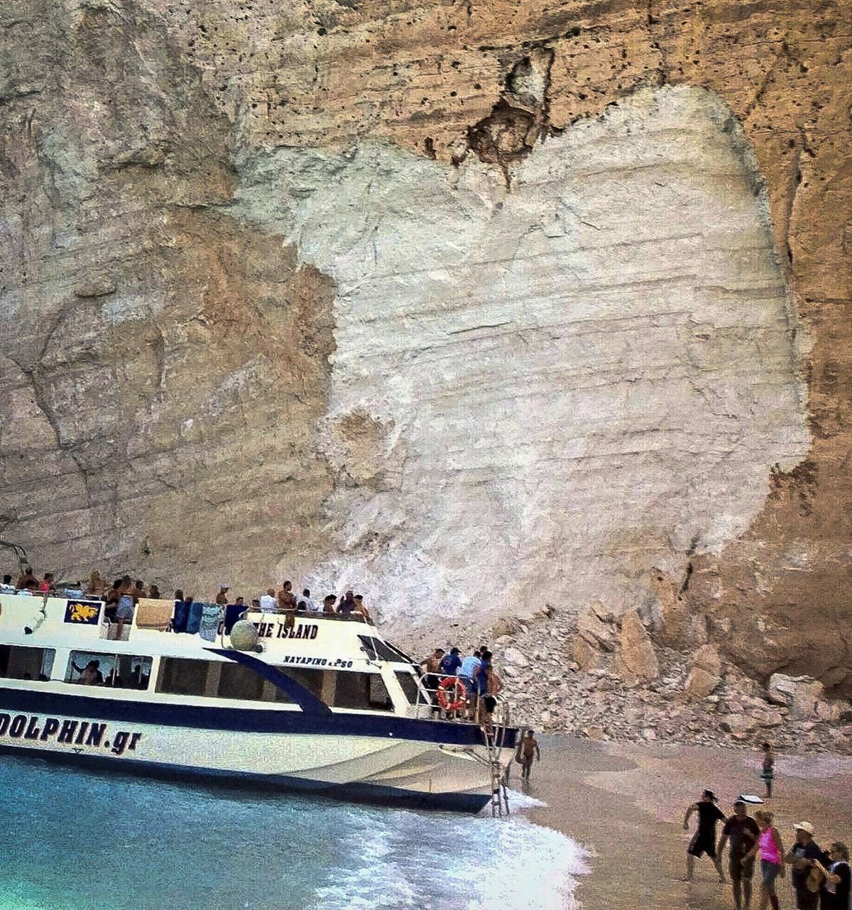 Video, ki ga je posnel očividec, prikazuje, kako je na plažo Navagio padel večji del 200-metrske pečine. "Najprej je zaropotalo in padla je skala, nato je padla še večja skala, potem pa še ena," je za grško tiskovno agencijo ANA povedal očividec. Skale bi skoraj zadele dva človeka, ki sta bila pod pečino.