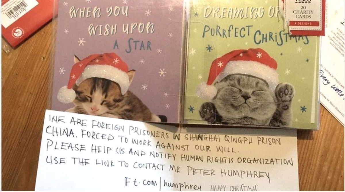 Po poročanju časnika Sunday Times je v voščilnici, namenjeni za dobrodelne namene, pisalo: "Smo tuji zaporniki v kitajskem zaporu Šanghaj Qingpu". "Prisiljeni smo delati proti naši volji. Prosim, pomagajte nam obvestiti organizacije za zaščito človekovih pravic," je še pisalo v voščilnici, na kateri je bila mucka z Božičkovo kapo, poroča francoska tiskovna agencija AFP