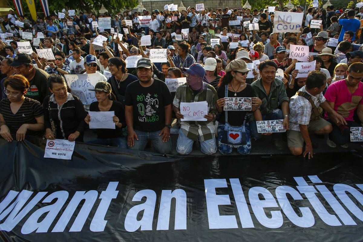 Kljub opozorilom se je danes v prestolnici Bangkok zbralo več deset nasprotnikov udara. Številni protestniki so nosili napise "Hunta ven" in "Stop udaru", nekateri pa so svoje nezadovoljstvo z vojaško vladavino izrazili tudi s pljuvanje proti vojakom.