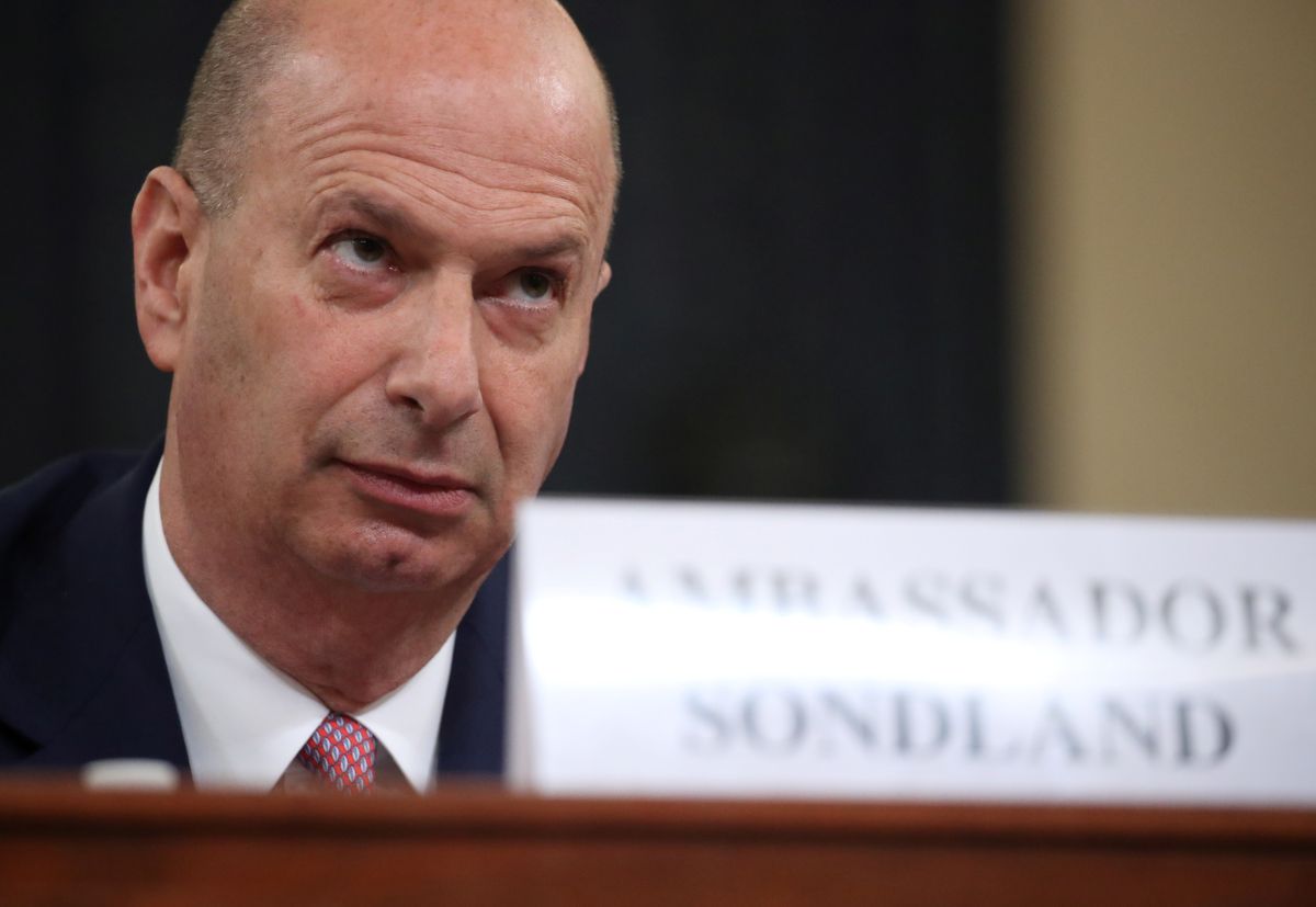 Sondland je novembra v predstavniškem domu ameriškega kongresa na zaslišanju pred ustavno obtožbo predsednika ZDA priznal, da je sodeloval s Trumpovim odvetnikom Rudyjem Giulianijem pri pritisku na Ukrajino, da v zameno za pomoč uvede preiskavo Josepha Bidna in njegovega sina Hunterja. Po njegovih besedah je šlo za "uslugo za uslugo" (quid pro quo).