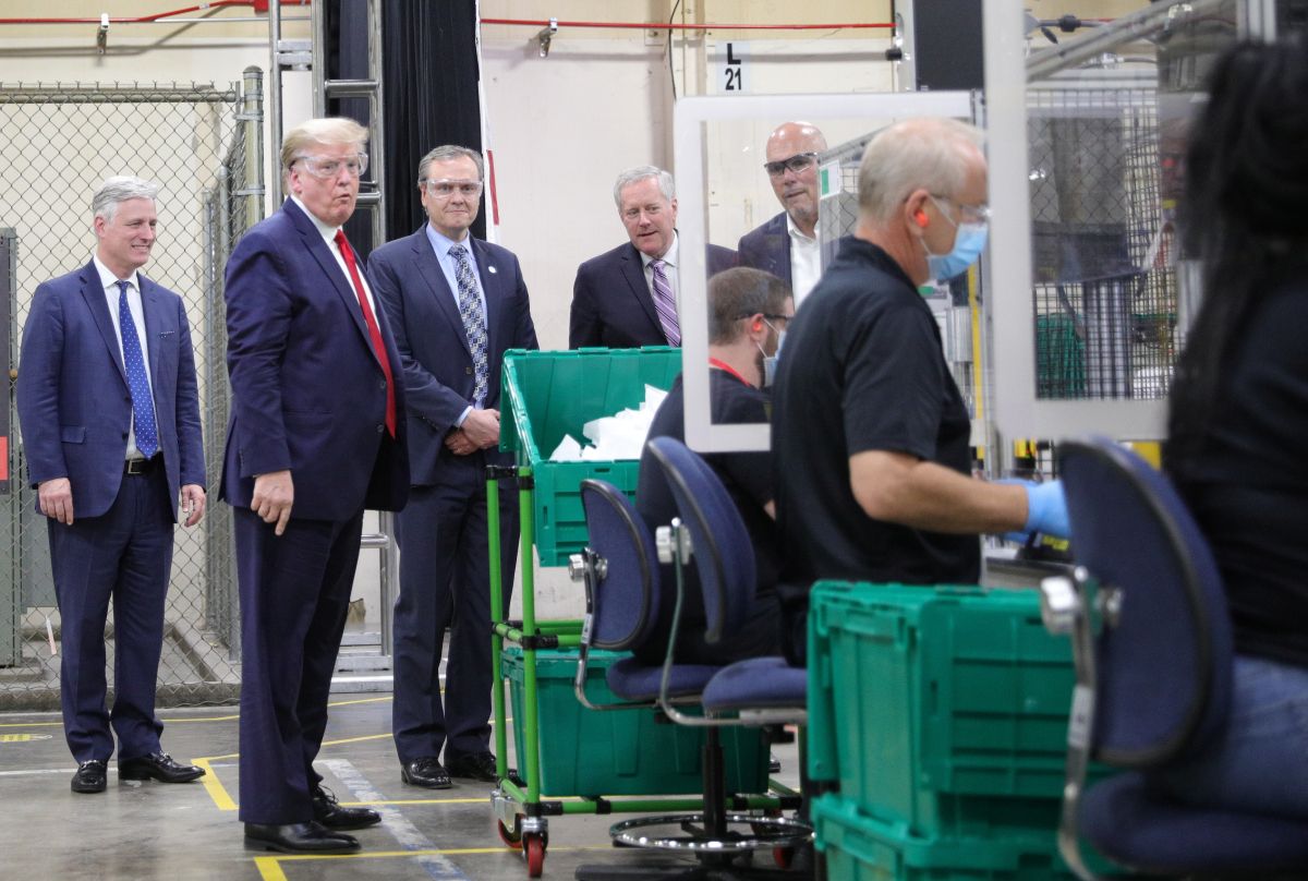 Trump na obisku tovarne mask brez maske: med obiskom so mu vrteli pesem Živi in pusti umreti