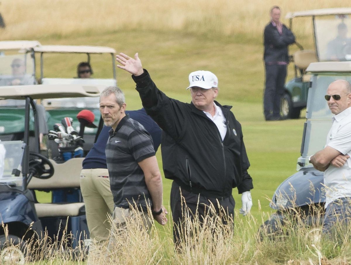 Na posnetkih je videti, kako Trump med igranjem golfa pomaha protestnikom, ki so kričali in mu žvižgali.