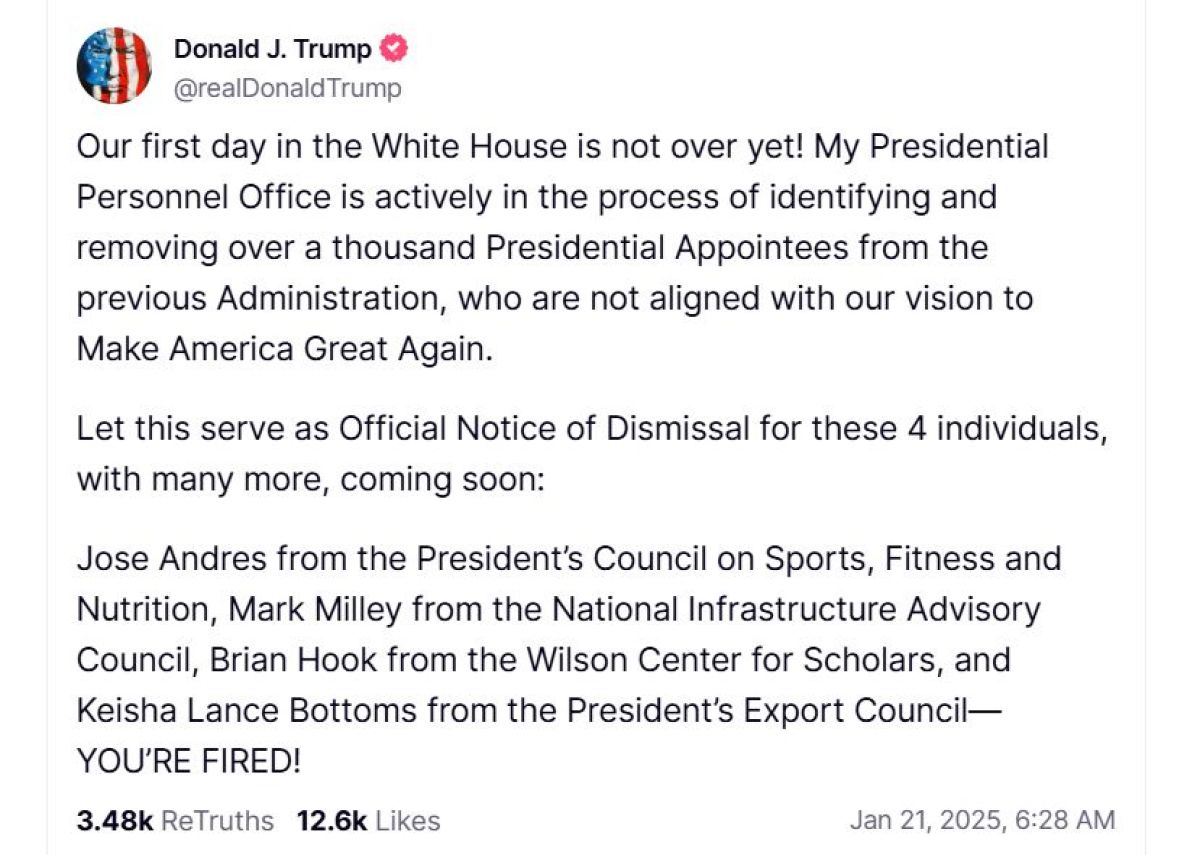 Ameriški predsednik Donald Trump je v davi v svoji prvi objavi na družabnem omrežju Truth Social po inavguraciji razrešil štiri visoke uradnike, ki jih je imenoval njegov predhodnik Joe Biden. V objavi je napovedal, da jih bo odpustil še "več kot tisoč".