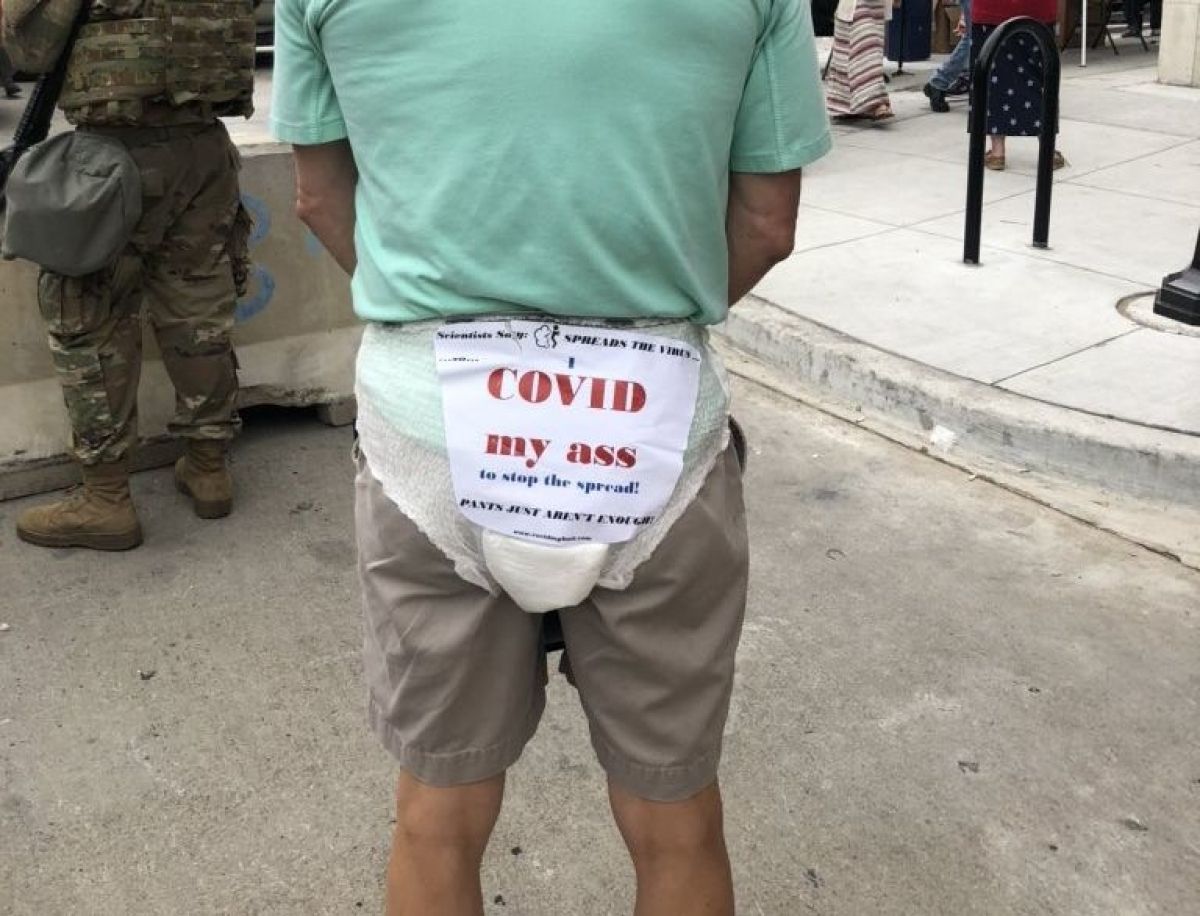 "Znanstveniki pravijo, da prdci širijo virus. Pokril sem si rit, da bi preprečil širjenje," je sporočal napis na plenici Trumpovega privrženca na shodu v Tulsi.