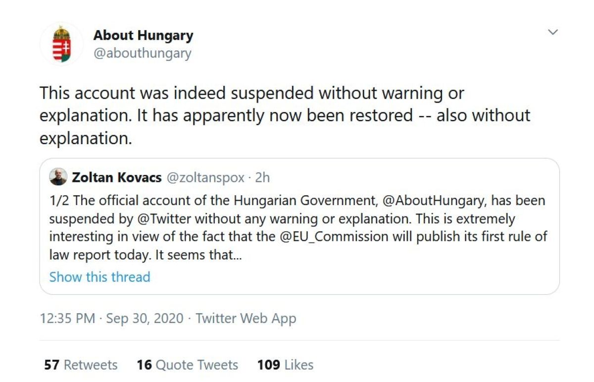 Račun madžarske vlade, ki je dostopen preko @abouthungary, so medtem spet vzpostavili. Kot so tvitnili, pri Twitterju niso pojasnili, zakaj račun ni več zaprt.