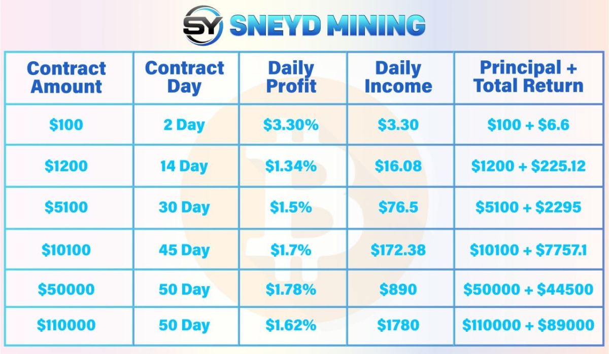 SNEYD je ena izmed vodilnih platform za oblačno rudarjenje, zasnovana posebej za začetnike. Odpravlja zapleten strokovni jezik in ponuja preprosto, pregledno uporabniško okolje, ki omogoča začetek rudarjenja z enim klikom. Tudi če ste popolnoma novi v svetu kriptovalut, lahko hitro začnete in takoj začnete zaslužiti. Kot eden izmed vodilnih svetovnih ponudnikov je SNEYD zavezan varni in uporabniku prijazni izkušnji oblačnega rudarjenja.