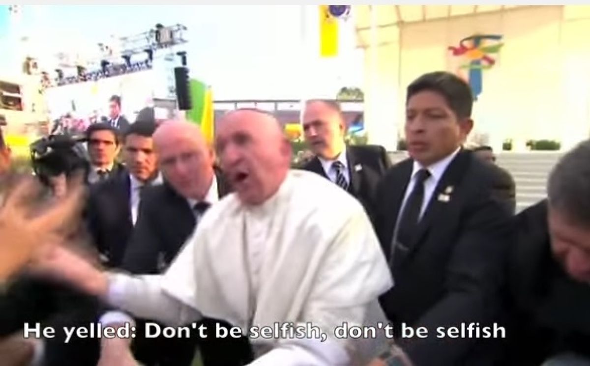Nekemu mladeniču je pri tem 79-letnega Frančiška uspelo močno potegniti za roko, zaradi česar je padel na invalida pred njim. Sveti oče se je hitro pobral, poljubil otroka na vozičku in se mu nasmehnil, a obraz se mu je takoj zatem pomračil, zatem pa je objestneža z jezno dvignjeno roko nadrl: "Ne bodi egoist, ne bodi egoist!" Tik zatem se je Frančišek že pomiril, na ustnice pa se mu je vrnil zanj običajni nasmešek.