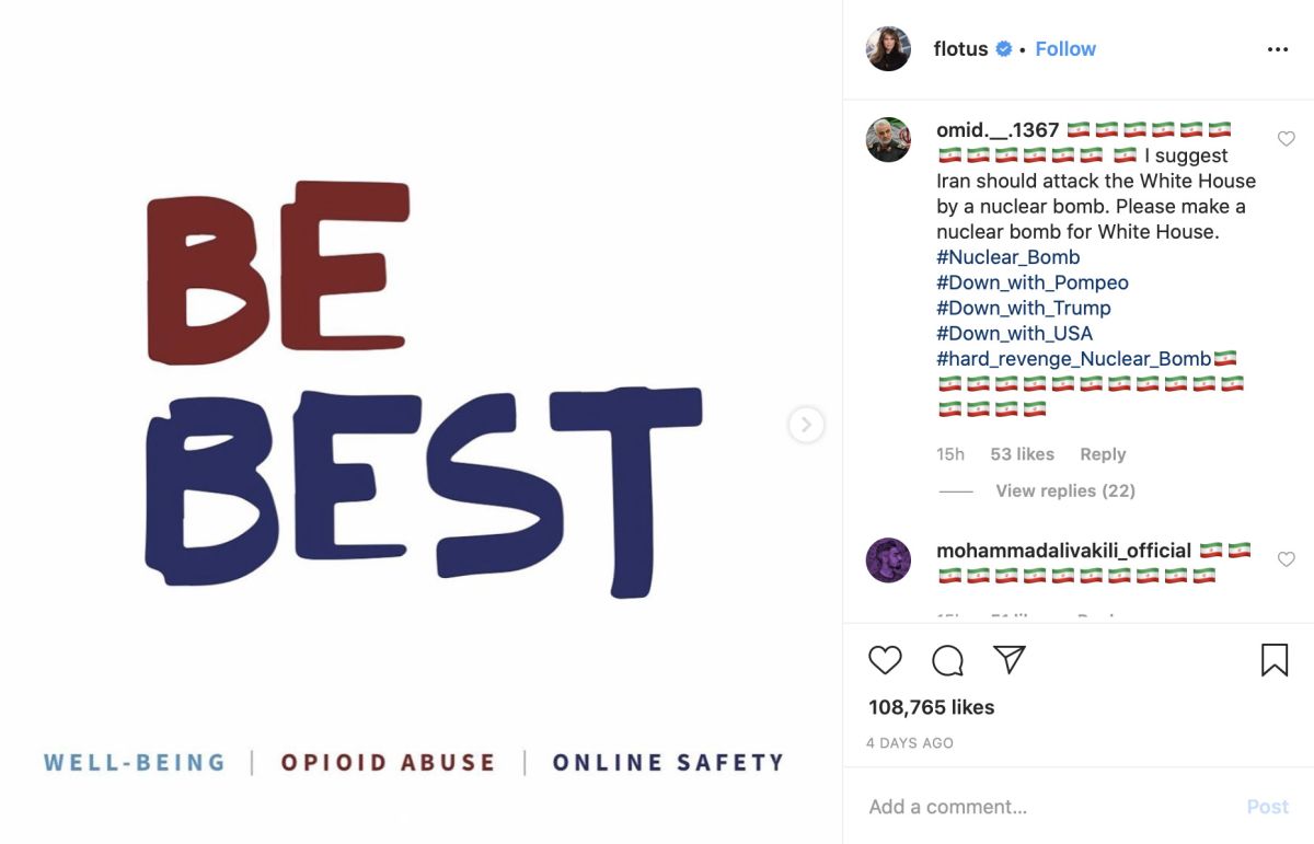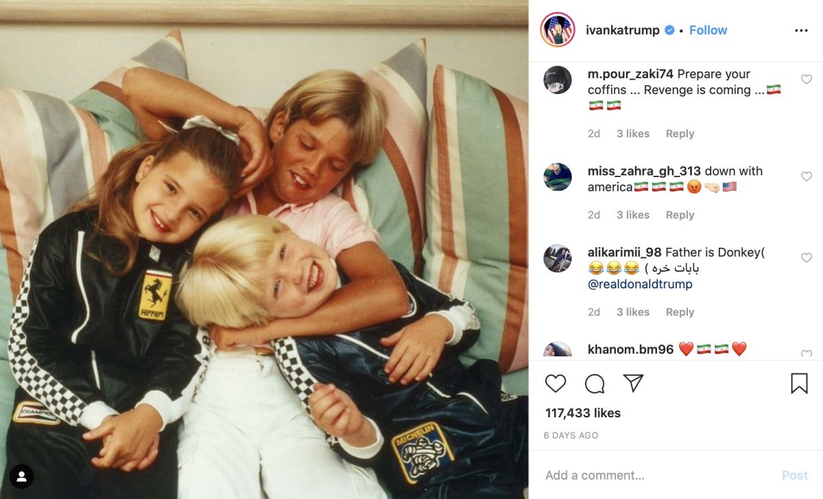 Če iranski hekerji delajo v tišini, so zato toliko bolj glasni Iranci na družbenih omrežjih. Na piko so med drugim vzeli Trumpovo hčerko Ivanko in tudi prvo damo Melanio ter njuna Instagram profila zasuli z grozilnimi sporočili. »Pripravite krste … Maščevanje prihaja,« je eden od vzorčnih zapisov na Ivankinem Instagramu, medtem ko na Instagramu prve dame pozivajo kar k jedrskemu napadu na Belo hišo ter ji sporočajo »J…š Trumpa!«